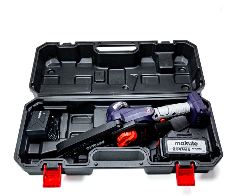 Ручной инструмент очень легок и мобилен. Вес электропилы 1.8 кг. Она не привязана к розетке. Аккумулятора емкостью 2 Ач и напряжением в 20 В хватает для работы в течение 1 - 2 часов. Зарядное устройство снабжено индикатором: после окончания зарядки его цвет меняется с красного на зеленый.